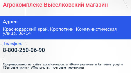 Агрокомплекс Выселковский, магазин по адресу Краснодарский край, Кропоткин, Коммунистическая улица, 36/14 в дальнейшем Организация, размещена в следующих категориях: