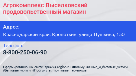 Агрокомплекс Выселковский, продовольственный магазин по адресу Краснодарский край, Кропоткин, улица Пушкина, 150 в дальнейшем Организация, размещена в следующих категориях: