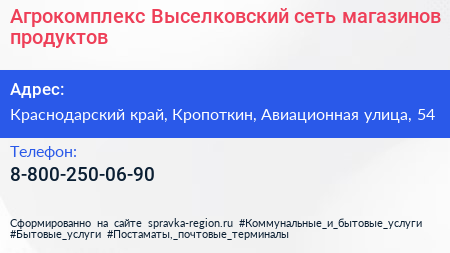 Агрокомплекс Выселковский, сеть магазинов продуктов по адресу Краснодарский край, Кропоткин, Авиационная улица, 54 в дальнейшем Организация, размещена в следующих категориях: