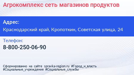 Агрокомплекс, сеть магазинов продуктов по адресу Краснодарский край, Кропоткин, Советская улица, 24 в дальнейшем Организация, размещена в следующих категориях: