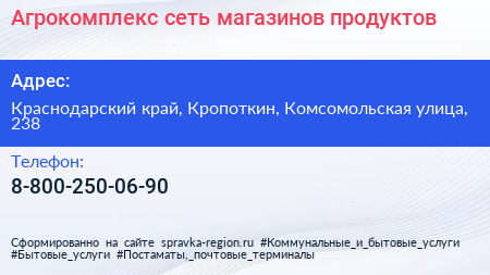 Агрокомплекс, сеть магазинов продуктов по адресу Краснодарский край, Кропоткин, Комсомольская улица, 238 в дальнейшем Организация, размещена в следующих категориях: