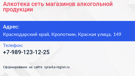 Алкотека, сеть магазинов алкогольной продукции по адресу Краснодарский край, Кропоткин, Красная улица, 149 в дальнейшем Организация, размещена в следующих категориях: