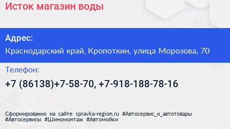 Исток, магазин воды по адресу Краснодарский край, Кропоткин, улица Морозова, 70 в дальнейшем Организация, размещена в следующих категориях: