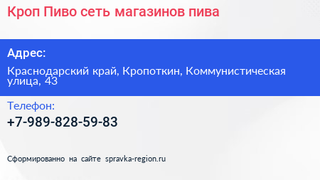Кроп-Пиво, сеть магазинов пива по адресу Краснодарский край, Кропоткин, Коммунистическая улица, 43 в дальнейшем Организация, размещена в следующих категориях:
