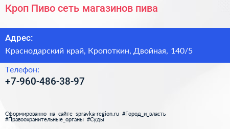 Кроп-Пиво, сеть магазинов пива по адресу Краснодарский край, Кропоткин, Двойная, 140/5 в дальнейшем Организация, размещена в следующих категориях: