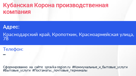 Кубанская Корона, производственная компания по адресу Краснодарский край, Кропоткин, Красноармейская улица, 78 в дальнейшем Организация, размещена в следующих категориях: