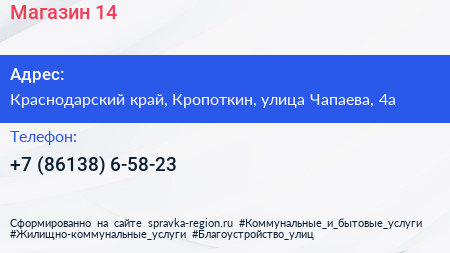 Магазин №14 по адресу Краснодарский край, Кропоткин, улица Чапаева, 4а в дальнейшем Организация, размещена в следующих категориях: