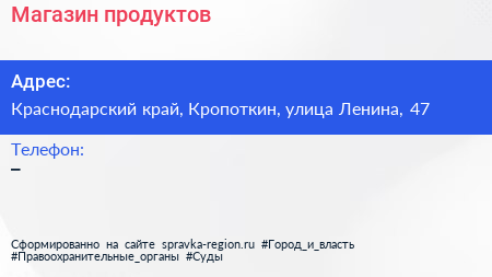 Магазин продуктов по адресу Краснодарский край, Кропоткин, улица Ленина, 47 в дальнейшем Организация, размещена в следующих категориях: