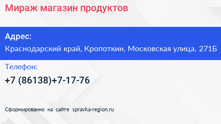 Мираж, магазин продуктов по адресу Краснодарский край, Кропоткин, Московская улица, 271Б в дальнейшем Организация, размещена в следующих категориях: