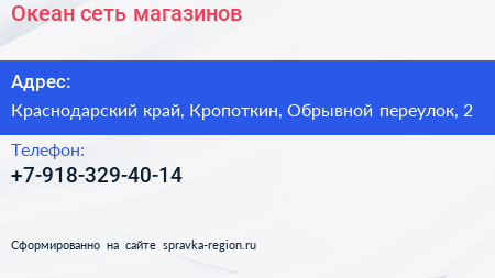 Океан, сеть магазинов по адресу Краснодарский край, Кропоткин, Обрывной переулок, 2 в дальнейшем Организация, размещена в следующих категориях: