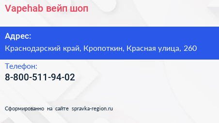 Vapehab, вейп-шоп по адресу Краснодарский край, Кропоткин, Красная улица, 260 в дальнейшем Организация, размещена в следующих категориях: