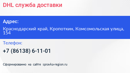 DHL, служба доставки по адресу Краснодарский край, Кропоткин, Комсомольская улица, 154 в дальнейшем Организация, размещена в следующих категориях: