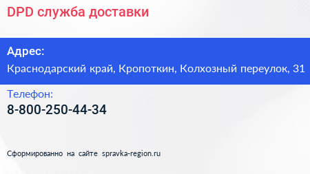 DPD, служба доставки по адресу Краснодарский край, Кропоткин, Колхозный переулок, 31 в дальнейшем Организация, размещена в следующих категориях: