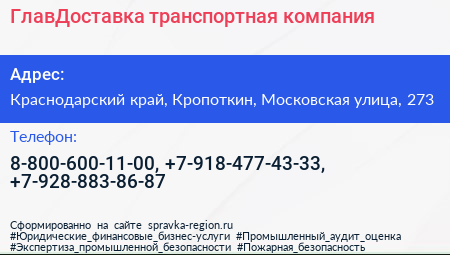 ГлавДоставка, транспортная компания по адресу Краснодарский край, Кропоткин, Московская улица, 273 в дальнейшем Организация, размещена в следующих категориях: