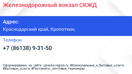Железнодорожный вокзал, СКЖД по адресу Краснодарский край, Кропоткин, в дальнейшем Организация, размещена в следующих категориях: