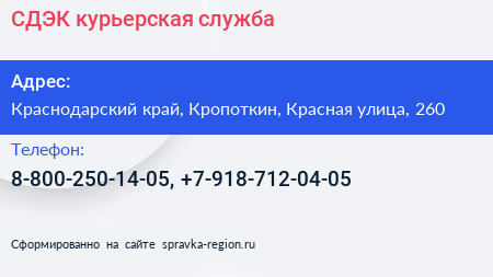 СДЭК, курьерская служба по адресу Краснодарский край, Кропоткин, Красная улица, 260 в дальнейшем Организация, размещена в следующих категориях: