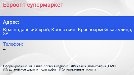 Евроопт, супермаркет по адресу Краснодарский край, Кропоткин, Красноармейская улица, 36 в дальнейшем Организация, размещена в следующих категориях: