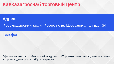 Кавказагроснаб, торговый центр по адресу Краснодарский край, Кропоткин, Шоссейная улица, 34 в дальнейшем Организация, размещена в следующих категориях: