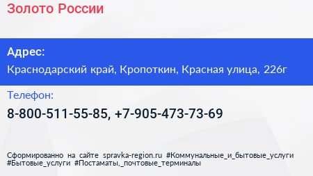 Золото России по адресу Краснодарский край, Кропоткин, Красная улица, 226г в дальнейшем Организация, размещена в следующих категориях: