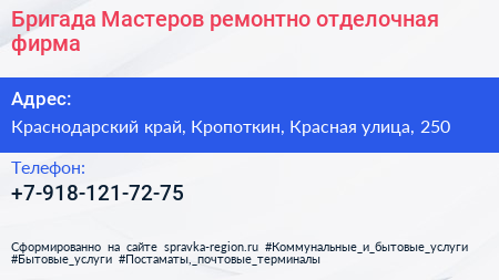 Бригада Мастеров, ремонтно-отделочная фирма по адресу Краснодарский край, Кропоткин, Красная улица, 250 в дальнейшем Организация, размещена в следующих категориях:
