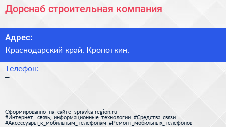 Дорснаб, строительная компания по адресу Краснодарский край, Кропоткин, в дальнейшем Организация, размещена в следующих категориях: