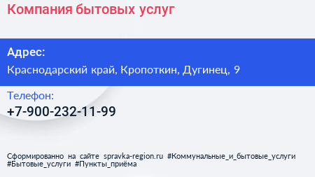 Компания бытовых услуг по адресу Краснодарский край, Кропоткин, Дугинец, 9 в дальнейшем Организация, размещена в следующих категориях: