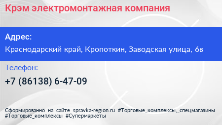 Крэм, электромонтажная компания по адресу Краснодарский край, Кропоткин, Заводская улица, 6в в дальнейшем Организация, размещена в следующих категориях:
