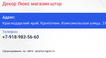 Декор-Люкс, магазин штор по адресу Краснодарский край, Кропоткин, Комсомольская улица, 19 в дальнейшем Организация, размещена в следующих категориях: