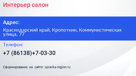 Интерьер, салон по адресу Краснодарский край, Кропоткин, Коммунистическая улица, 77 в дальнейшем Организация, размещена в следующих категориях: