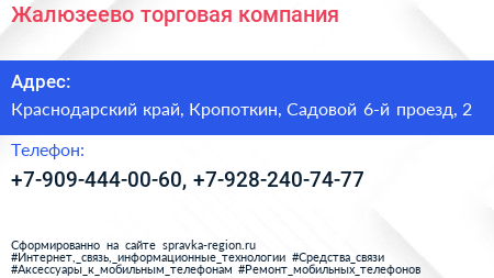 Жалюзеево, торговая компания по адресу Краснодарский край, Кропоткин, Садовой 6-й проезд, 2 в дальнейшем Организация, размещена в следующих категориях: