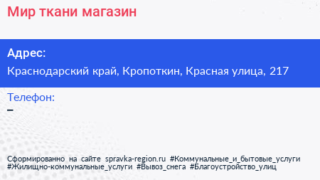 Мир ткани, магазин по адресу Краснодарский край, Кропоткин, Красная улица, 217 в дальнейшем Организация, размещена в следующих категориях: