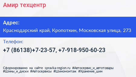 Амир, техцентр по адресу Краснодарский край, Кропоткин, Московская улица, 273 в дальнейшем Организация, размещена в следующих категориях: