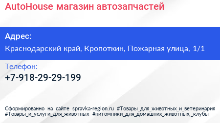 AutoHouse, магазин автозапчастей по адресу Краснодарский край, Кропоткин, Пожарная улица, 1/1 в дальнейшем Организация, размещена в следующих категориях:
