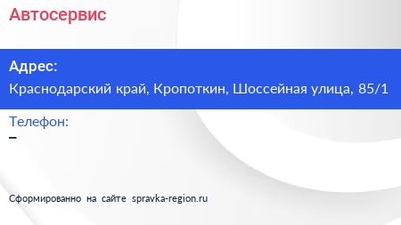 Автосервис по адресу Краснодарский край, Кропоткин, Шоссейная улица, 85/1 в дальнейшем Организация, размещена в следующих категориях: