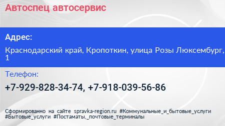 Автоспец, автосервис по адресу Краснодарский край, Кропоткин, улица Розы Люксембург, 1 в дальнейшем Организация, размещена в следующих категориях: