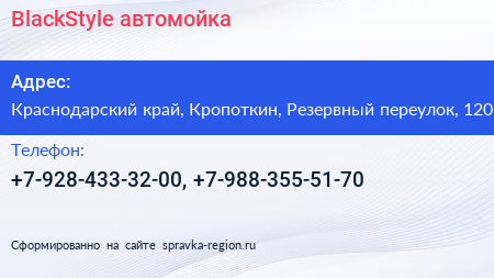 BlackStyle, автомойка по адресу Краснодарский край, Кропоткин, Резервный переулок, 120 в дальнейшем Организация, размещена в следующих категориях: