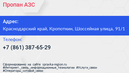 Пропан, АЗС по адресу Краснодарский край, Кропоткин, Шоссейная улица, 91/1 в дальнейшем Организация, размещена в следующих категориях: