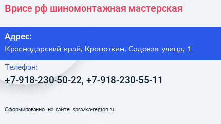 Врисе.рф, шиномонтажная мастерская по адресу Краснодарский край, Кропоткин, Садовая улица, 1 в дальнейшем Организация, размещена в следующих категориях: