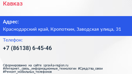 Кавказ по адресу Краснодарский край, Кропоткин, Заводская улица, 31 в дальнейшем Организация, размещена в следующих категориях: