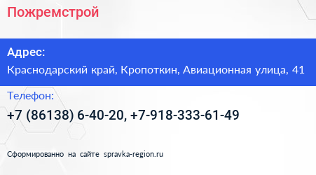 Пожремстрой по адресу Краснодарский край, Кропоткин, Авиационная улица, 41 в дальнейшем Организация, размещена в следующих категориях:
