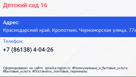 Детский сад №16 по адресу Краснодарский край, Кропоткин, Черноморская улица, 77а в дальнейшем Организация, размещена в следующих категориях: