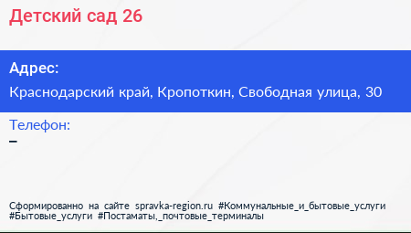Детский сад №26 по адресу Краснодарский край, Кропоткин, Свободная улица, 30 в дальнейшем Организация, размещена в следующих категориях: