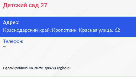 Детский сад №27 по адресу Краснодарский край, Кропоткин, Красная улица, 62 в дальнейшем Организация, размещена в следующих категориях: