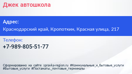 Джек, автошкола по адресу Краснодарский край, Кропоткин, Красная улица, 217 в дальнейшем Организация, размещена в следующих категориях: