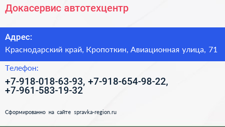 Докасервис, автотехцентр по адресу Краснодарский край, Кропоткин, Авиационная улица, 71 в дальнейшем Организация, размещена в следующих категориях: