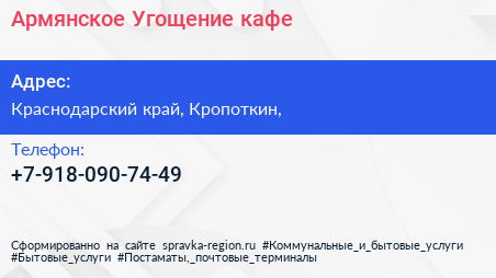 Армянское Угощение, кафе по адресу Краснодарский край, Кропоткин, в дальнейшем Организация, размещена в следующих категориях: