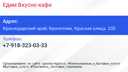 Едим Вкусно, кафе по адресу Краснодарский край, Кропоткин, Красная улица, 232 в дальнейшем Организация, размещена в следующих категориях: