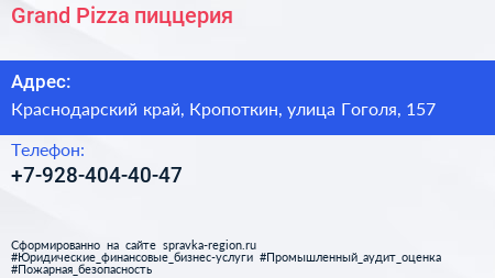 Grand-Pizza, пиццерия по адресу Краснодарский край, Кропоткин, улица Гоголя, 157 в дальнейшем Организация, размещена в следующих категориях: