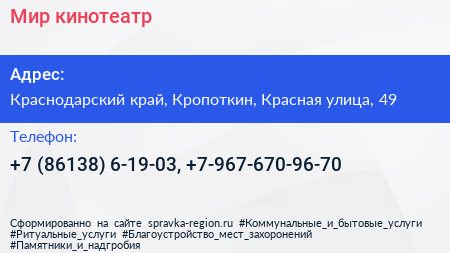 Мир, кинотеатр по адресу Краснодарский край, Кропоткин, Красная улица, 49 в дальнейшем Организация, размещена в следующих категориях: