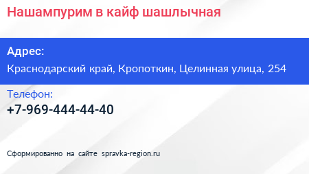 Нашампурим в кайф, шашлычная по адресу Краснодарский край, Кропоткин, Целинная улица, 254 в дальнейшем Организация, размещена в следующих категориях: